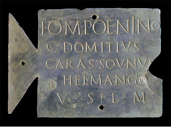 Moi, c’est Caius Domitius Carassounus, homme d’affaires. Pour mon négoce, je devais passer le Summus Poeninus (col du Grand-Saint-Bernard). Au col, il y avait un sanctuaire de Jupiter Poeninus, le dieu local. Je lui ai donné un jour cet ex-voto, en y précisant mon origine : HEL pour Helvète ; et mon métier : MANGO, marchand d’esclaves. Ex-voto de l’Helvète Caius Domitius Carassounus, marchand d’esclaves Trouvé au col du Grand-Saint-Bernard Bronze, époque romaine I(ovi) O(ptimo) M(aximo) Poenino C(aius) Domitius Carassounus Hel(vetius) mango v(otum) s(olvit) l(ibens) m(erito) A Jupiter Poeninus très bon et très grand, de Caius Domitius Carassounus, marchand d’esclaves helvète, qui s’est volontiers acquitté de son voeu Prêt du Musée national suisse, Zurich |