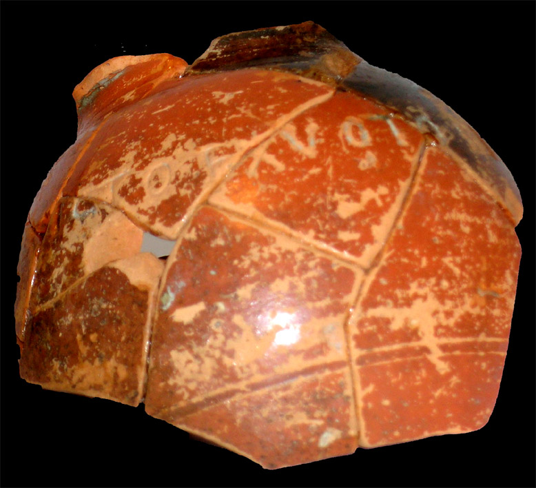 Le dieu Mithra, venu de Perse, avait des fidèles dans tout l’empire. Un temple lui était consacré à Forum Claudii Vallensium (Martigny). Moi, Paternus, je lui ai demandé son secours et il m’a exaucé. Alors je lui ai offert ce gobelet où j’ai inscrit : « Paternus en ex-voto au dieu invincible ; il boit… ». Parce que si je bois, c’est que je suis sauvé et bien vivant ! D’ailleurs, à l’époque, BIBIT (il boit) se prononçait presque comme VIVIT (il vit). Et les dieux comprennent sûrement les jeux de mots. Gobelet votif de Paternus à Mithra Trouvé à Forum Claudii Vallensium (Martigny) Terre cuite, 2ème 3ème siècle Pat(ern)us deo invicto ex voto bibit… De Paternus en ex voto au dieu invaincu ; il boit… Prêt du Musée cantonal d’archéologie, Sion |