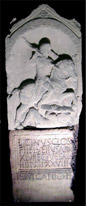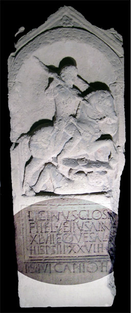 Licinus, était le fils de Clossus ; avec d’autres helvètes comme lui, il servait dans un régiment de cavalerie espagnol affecté à la 22e légion romaine, en Germanie, sur le Rhin, là où l’empire s’arrête face au danger barbare. Licinus est mort là, à 47 ans, après 26 ans d’armée. Moi, Tiberius Iulius Capito qui étais son héritier, j’ai fait ériger cette stèle sur sa tombe : sur la pierre, il chevauche encore et terrasse l’ennemi ; c’est ce que fut sa vie. Mais dessous, il repose enfin en paix. Stèle funéraire du cavalier helvète Licinus Trouvée à Worms (Allemagne) Licinus Clossi f(ilius) Helvetius ann(orum) XLVII eques alae Hisp(anorum) stip(endium) XXVI h(ic) s(itus est) Tiberius Iulus Capito h(eres) Ici repose Licinus, fils de Clossus, 47 ans, cavalier helvète dans l’aile espagnole, 26 ans de service. Tiberius Iulius Capito, son héritier… Prêt du Musée national suisse, Zurich |