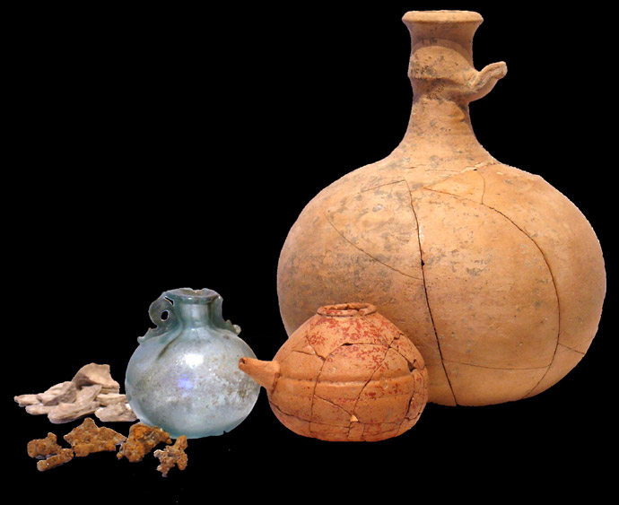 Je suis né au cours du 2ème siècle à Payerne, pas loin de la ville d’Aventicum. Mais ma vie n’a duré que six mois. Dans la fosse, à côté de mon petit cercueil en sapin cloué, ils ont placé une cruche de boisson. Dans le cercueil, d’un côté de ma tête, ils ont mis un petit flacon de baume en verre, et de l’autre, ils ont posé mon biberon. Sépulture de nourrisson, avec balsamaire en verre, cruche et biberon Trouvée à Payerne, route de Bussy 2ème siècle après J.-C. Prêt du Musée cantonal d’archéologie et d’histoire, Lausanne |