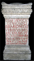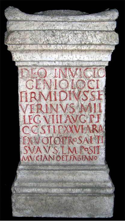 Cette année-là, Mucianus et Fabianus étaient consuls à Rome, et l’empereur Caracalla régnait depuis 3 ans. Moi, Firmidius Severinus, soldat de la VIIIème légion, après 26 ans de service (au lieu de 20, mais la guerre civile de 193 à 197, sous Septime-Sévère, a retardé ma libération), adepte du dieu perse Mithra comme bien des camarades, je lui ai dressé cet autel pour avoir, selon mon vœu, assuré mon salut. C’était il y a exactement 1803 ans, en l’an 201. Autel de Firmidius Severinus à Mithra Trouvé à Genava (Genève) 201 après J.-C. Deo invicto Genio loci Firmidius Severinus mil(es) leg(ionis) VIII Aug(ustae) p(iaie) f(idelis) c(onstantis) C(ommodae) stip(endiis) XXVI aram ex voto pro salute sua v(otum) s(olvit) l(ibens) m(erito) posita Muciano et Fabiano co(n)s(ulibus) Au dieu invaincu et au génie du lieu, Firmidius Severinus, soldat de la VIIIème légion Auguste, pieuse et fidèle à Commode, a érigé cet autel pour son salut après 26 ans de service, après un vœu dont il s’acquitte volontiers. Sous le consulat de Mucianus et de Fabianus. Prêt du Musée national suisse, Zurich |