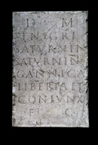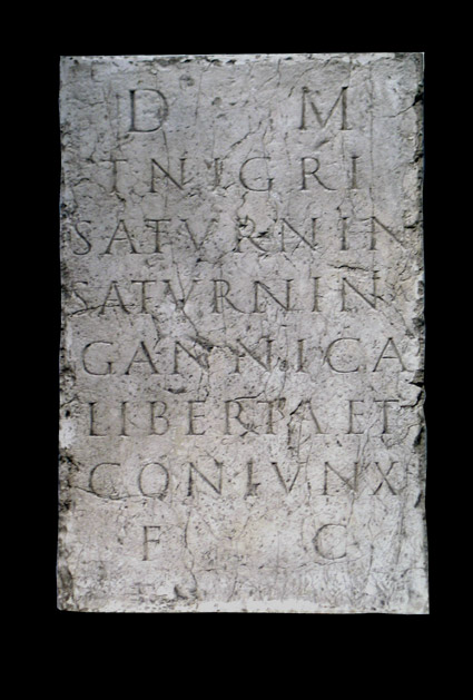 Il était une fois, à Aventicum, une esclave indigène au nom bien gaulois : Gannica. Elle appartenait à Titus Nigrius Saturninus. Il lui offrit la liberté en l’affranchissant. Elle prit alors pour prénom le surnom de son bienfaiteur et devint Saturninia Gannica. Puis ils se marièrent. C’est mon histoire… Moi, Saturninia Gannica, j’ai fait poser cette pierre sur la tombe de celui qui fut mon maître puis mon époux. Stèle de Titus Nigrius Saturninus Découverte à Morat (Fribourg), où elle a sans doute été transportée depuis Avenches (Vaud) D(is) M(anibus) T(iti) Nigi Saturnini Saturninia Gannica liberta et coniunx f(aciendum) c(uravit) Aux Dieux Mânes de Titus Nigrius Saturninus, Saturninia Gannica, son affranchie et épouse, a fait poser cette pierre. Prêt du Musée national suisse, Zurich |