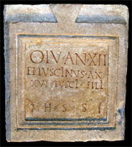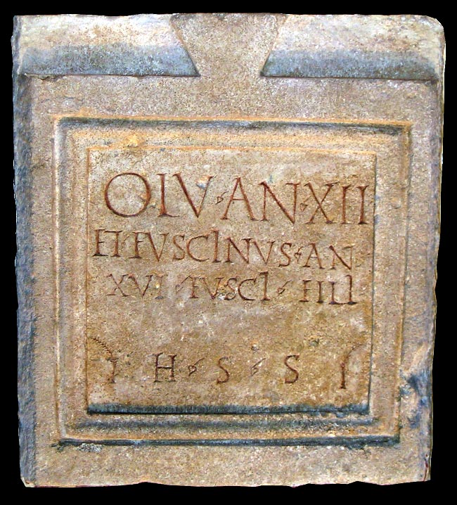 On était nés esclaves, mon frère et moi. Papa s’appelait Fuscus (le basané). Nous aussi, on nous avait donné des noms typiques d’esclaves: Olus (légume de cuisine, chou) et Fuscinus (le petit basané). On a eu, du côté d’Augusta Raurica, une vie bien courte : 12 ans et 16 ans. On nous a enterrés ensemble, juste sous cette pierre. Pierre tombale des frères Olus et Fuscinus Trouvée à Bâle Olu(s) an(norum) XII et Fuscinus an(norum) XVI Fusci fili H(ic) s(iti) s(unt) Olus, 12 ans, et Fuscinus, 16 ans, fils de Fuscus, reposent ici. Prêt du Römermuseum Augst |